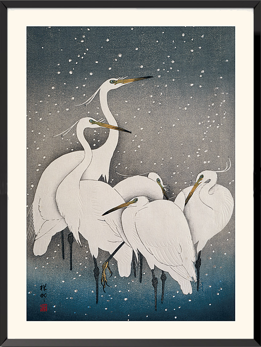 Neglecting the large landscapes that created the glory of Hiroshige and Hokusai, Ohara Koson focused almost exclusively on depicting plants and animals whose particular textures and behaviour he had scrupulously observed. His plates of birds, with their admirable perfection, reveal the sublime mastery of his art and solid knowledge of ornithology. Like Kawase Hasui, Ohara Koson remains little-known in Europe where, for many enthusiasts, the art of Japanese prints is limited to such grand masters as Hiroshige and Hokusai.