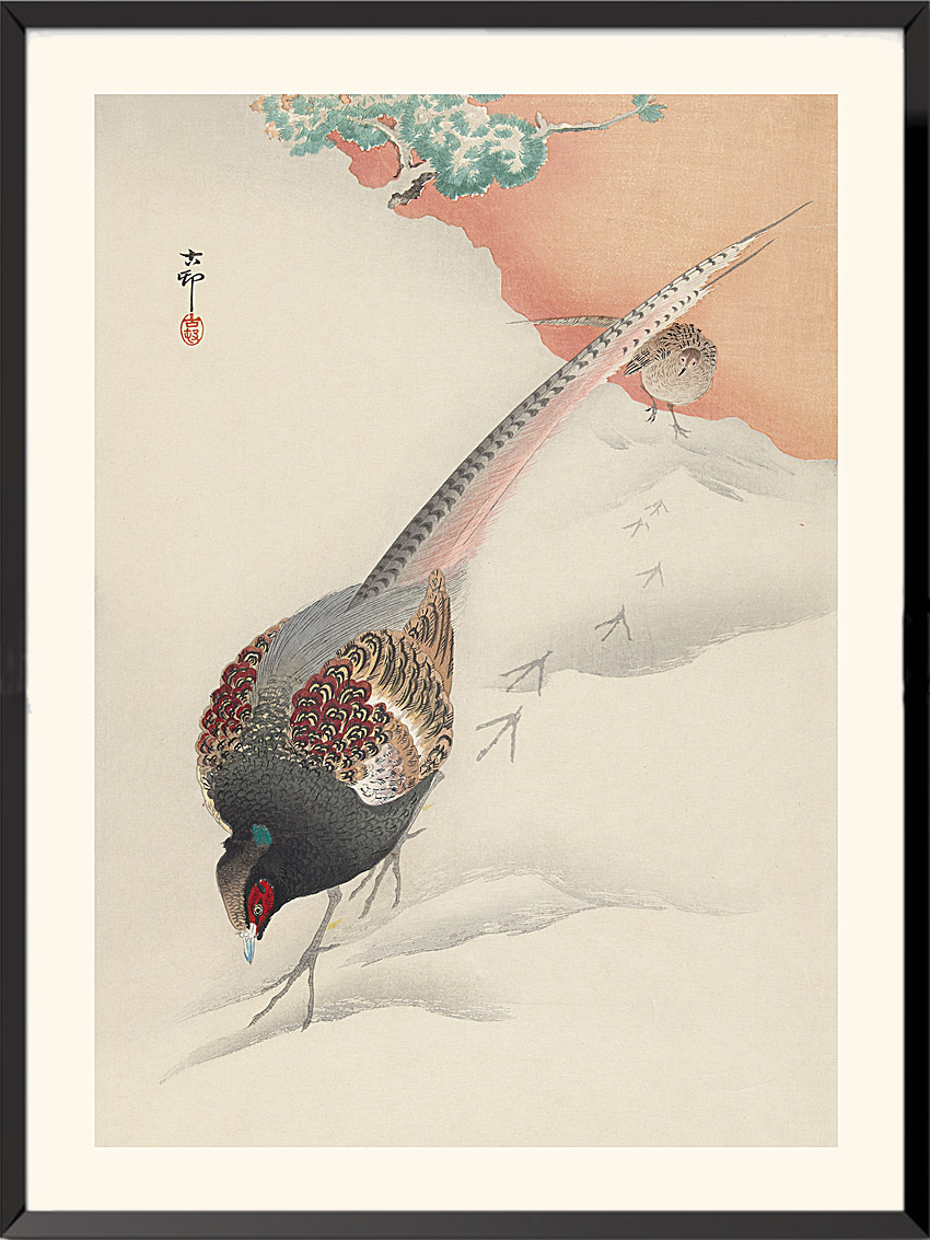 Neglecting the large landscapes that created the glory of Hiroshige and Hokusai, Ohara Koson focused almost exclusively on depicting plants and animals whose particular textures and behaviour he had scrupulously observed. His plates of birds, with their admirable perfection, reveal the sublime mastery of his art and solid knowledge of ornithology. Like Kawase Hasui, Ohara Koson remains little-known in Europe where, for many enthusiasts, the art of Japanese prints is limited to such grand masters as Hiroshige and Hokusai.