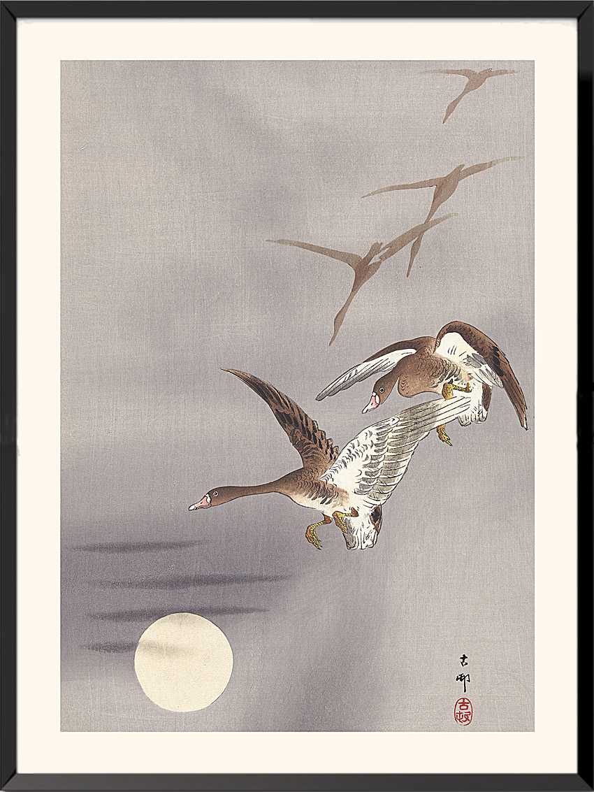 Neglecting the large landscapes that created the glory of Hiroshige and Hokusai, Ohara Koson focused almost exclusively on depicting plants and animals whose particular textures and behaviour he had scrupulously observed. His plates of birds, with their admirable perfection, reveal the sublime mastery of his art and solid knowledge of ornithology. Like Kawase Hasui, Ohara Koson remains little-known in Europe where, for many enthusiasts, the art of Japanese prints is limited to such grand masters as Hiroshige and Hokusai.